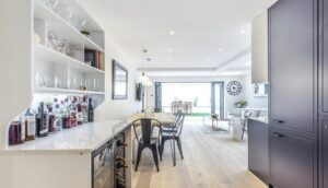 This property has undergone both a side and rear extension to alter the internal space. The rear walls were first removed to gain an open plan layout in addition to the new side extension, which has allowed for the addition of the new kitchen without drowning the remaining space. The layout allows for almost unlimited options for dinning, living room and utility spaces.